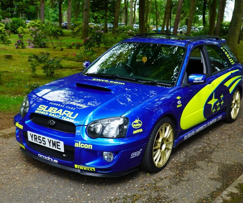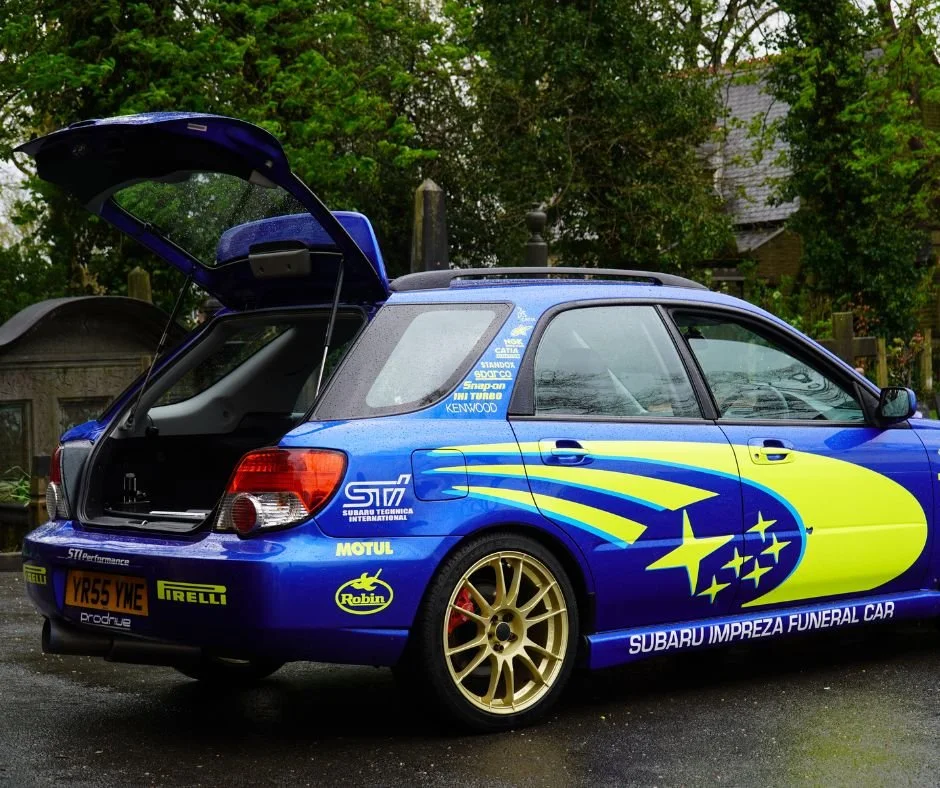 Our Subaru funeral car is an alternative hearse and a unique tribute to both petrolheads and motorsport enthusiasts alike. Originally a Subaru Impreza WRX, this vehicle has been meticulously converted to serve as a hearse, carrying forward the iconic design cues and livery of the classic Subaru Impreza that so many of us grew up admiring.